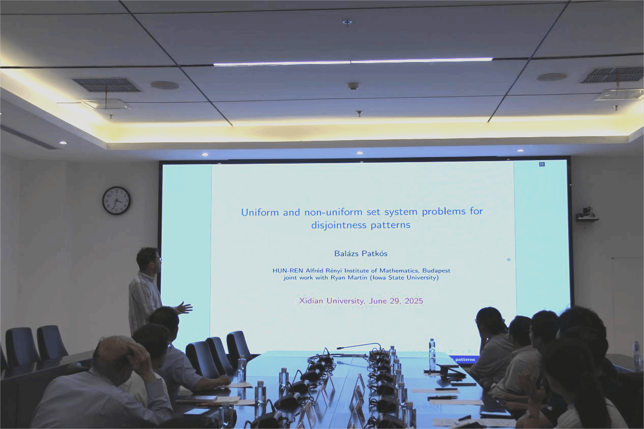 Balázs Patkós带来了题为“Uniform and non-uniform set system problems for disjointness patterns”的学术报告。Patkós围绕集合系统问题展开,聚焦于不相交模式在均匀和非均匀情况下的极值问题。他简要回顾了该问题的研究历史,介绍了Erdős、Ko和Rado等数学大师在该领域取得的经典成果,分享了他与Ryan R.Martin合作取得的最新研究成果,介绍了一种考虑不相交模式的一般框架。报告逻辑严谨,结合了大量实例,使在场师生对集合系统问题中的不相交模式有了更深刻的理解。