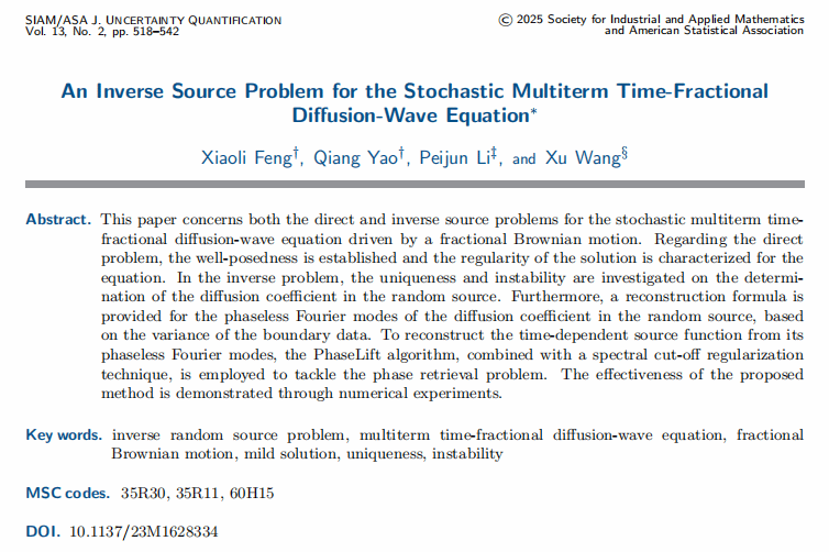 近期,BB贝博艾弗森冯晓莉副教授,研究生姚强和中国科公司数学与系统科学研究院李培军研究员,王旭副研究员合作,在随机微分方程反随机源的理论分析和数值计算方面取得新进展,相关结果发表在美国工业与应用数学学会旗下重要期刊SIAM/ASA Journal on Uncertainty Quantification上 [Xiaoli Feng, Qiang Yao, Peijun Li, Xu Wang, An inverse source problem for the stochastic multi-term time-fractional diffusion-wave equation, SIAM/ASA Journal on Uncertainty Quantification, 13(2), 518-542, 2025]。