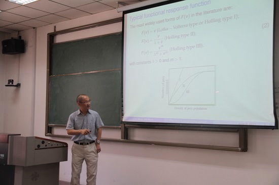 接着王教授介绍了食饵趋向性的生物含义、捕食-食饵系统中捕食者与被捕食者之间典型的相互作用关系以及带有食饵趋向性捕食-食饵系统的研究进展,并针对所研究方向目前尚未解决的问题进行了分析与总结,并鼓励有兴趣的老师和同学参与到这方面的研究。