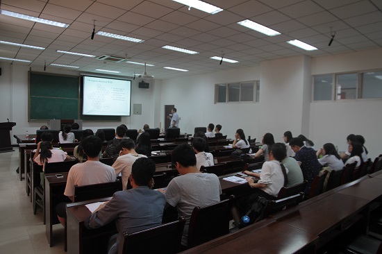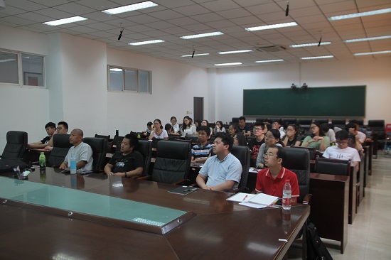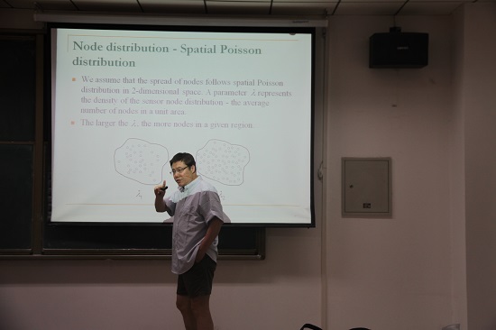 次日下午2:30,王大进教授作了题为“Introducing Some Recent Results on Network Research”学术报告。王教授首先介绍了无线传感器网络的背景知识,然后讲述了经典的无线传感器网络六边形分簇模型及其特点,针对于传感器节点分布问题,王教授重点讲述了空间泊松分布及其性质,报告会最后王教授讲述了无线传感器网络中的节点能耗计算和分离集群问题。此次报告会由朱强副教授主持。