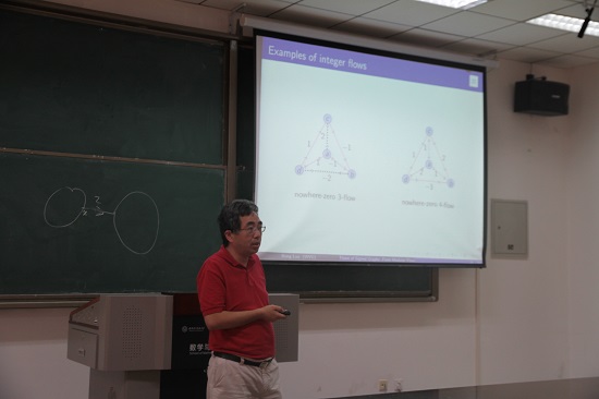 13日下午2:30,在公司经理刘三阳教授对罗荣教授做了简单的介绍之后,罗荣教授作了题为“Flows of Signed Graphs: From Modular Flows To Integer Flows”学术报告。罗教授首先介绍了一般图的整数流、非零k-流、非零2-流等概念以及流与四色定理、Seymour 6-流定理、Tutte关于整数流的几个著名猜想,然后介绍了模流和模流在试图攻克Tutte的猜想中的作用,进而引出了符号图的概念并介绍了符号图的模k定向、负边,边交换运算以及符号图中的整数流、模流等,紧接着着重讨论了符号图中整数流与模流的关系,介绍了一些最新的研究成果,最后详述了这些最新研究结论在整数流中的重要应用。