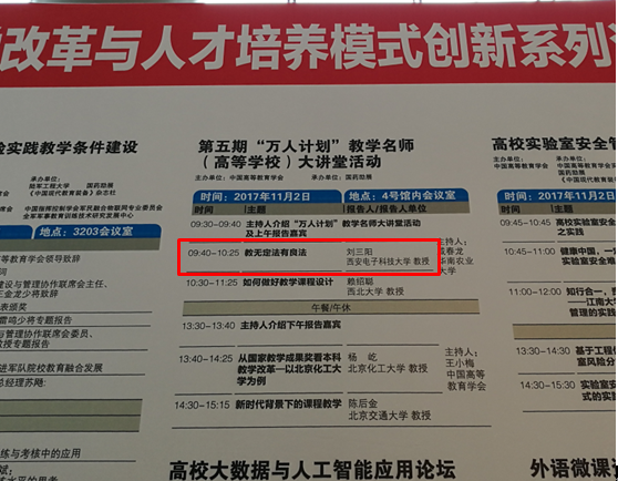 为广泛宣传教学名师教书育人的先进事迹,发挥教学名师在提高教学水平、培养青年教师中的示范作用,经教育部批准,中国高等教育学会于2017年11月2-4日在江苏省南京市国际博览中心举办了第五期“万人计划”教学名师大讲堂活动。国家级教学名师、“万人计划”教学名师、BB贝博艾弗森经理刘三阳教授继去年受邀在第四期名师大讲堂作主题报告后,今年再次应邀,于11月2日上午在第五期名师大讲堂作了首场报告:教无定法有良法,受到听众高度评价。
