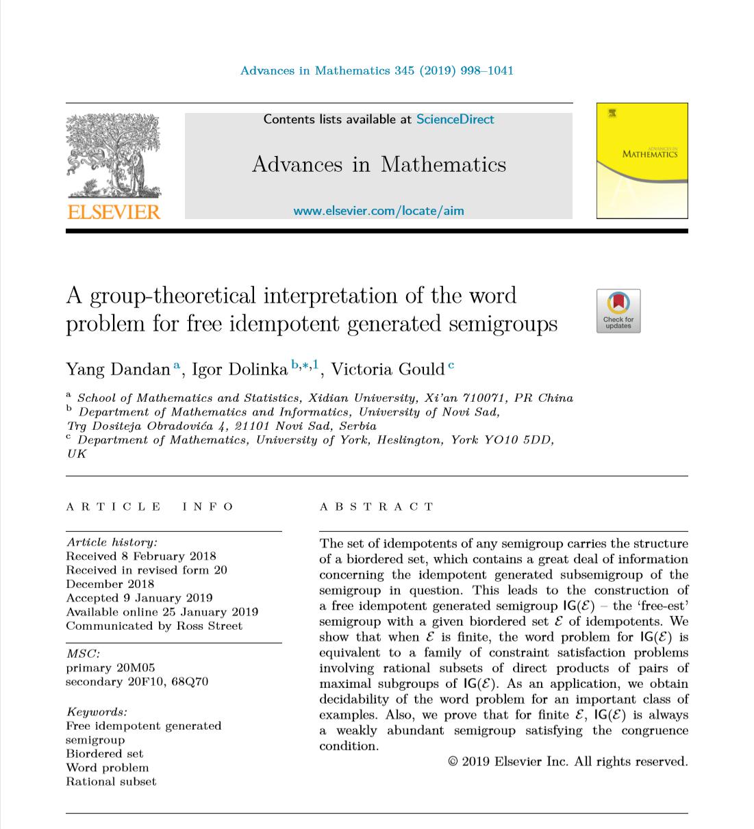 近日,BB贝博艾弗森杨丹丹副教授与塞尔维亚诺维萨德大学Igor Dolinka教授和英国约克大学Victoria Gould教授合作,在国际顶级数学期刊《Advances in Mathematics》上发表了题为“A group-theoretical interpretation of the word problem for free idempotent generated semigroups”的学术论文,正式发表期卷号: Advances in Mathematics, 345, 2019, 998-1041。