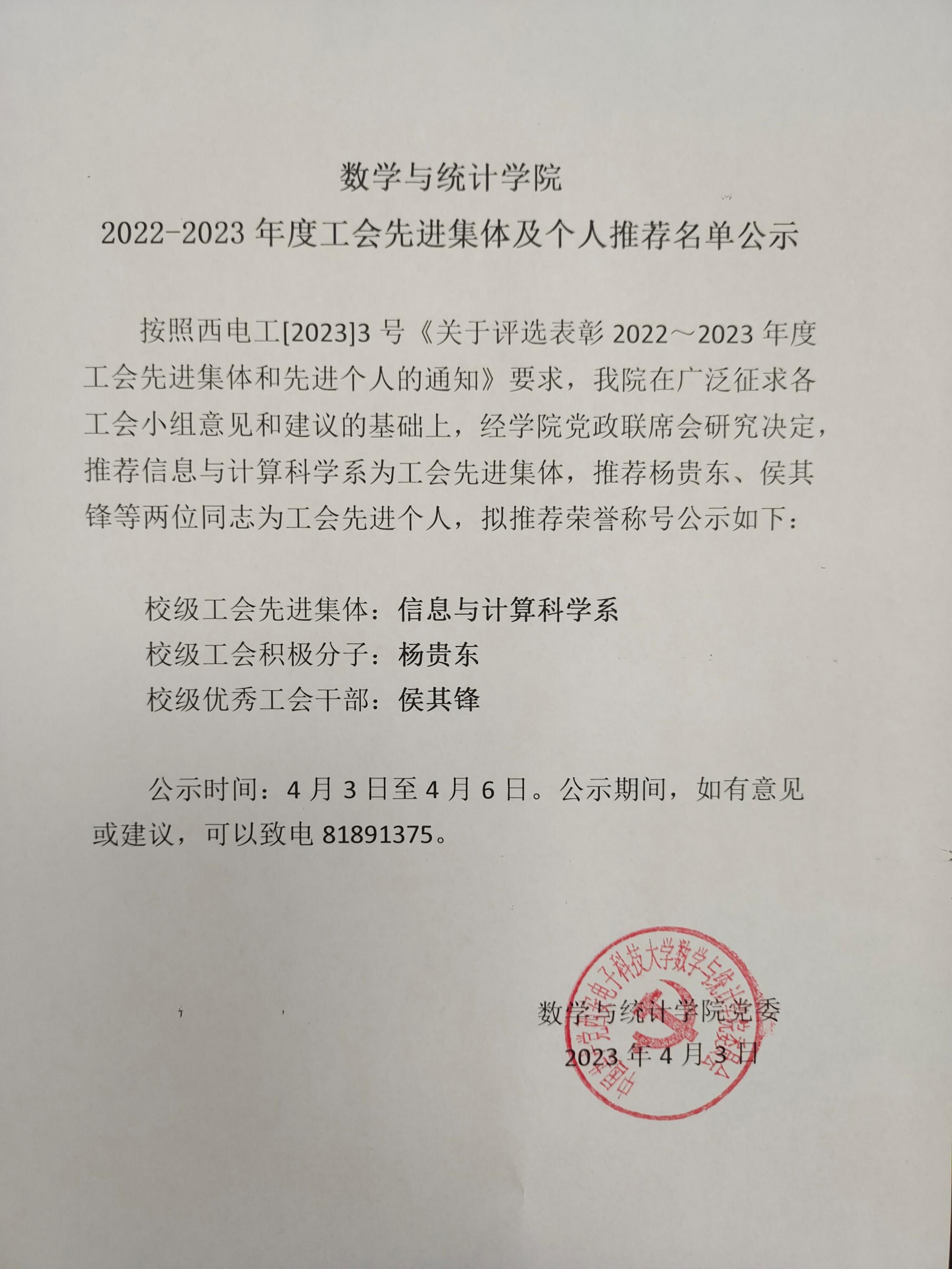 2022-2023年度工会先进集体及个人推荐名单公示