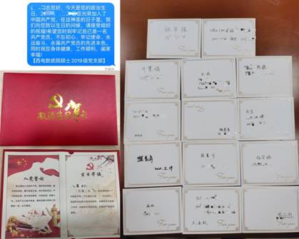 此次党日活动包括向过“政治生日”的6名同志发送祝福短信、赠送“生日贺卡”、每位同志写下对自己五年后的寄语、分享生日蛋糕等四个环节。支部书记陈谌代表支部全体成员在这6名同志“政治生日”当天为他们发送了祝福短信。“XX同志您好,今天是您的政治生日,在这神圣的日子里,我们向您致以生日的问候,请接受组织的祝福!希望您时刻牢记自己是一名共产党员,不忘初心、牢记使命、永远奋斗,永葆共产党员的先进本色。同时祝您身体健康,工作顺利,阖家幸福!”短信中这样写到。活动当天还向在校的5名同志赠送了“生日贺卡”,鼓励大家牢记入党誓词,不忘初心,坚定不移跟党走。