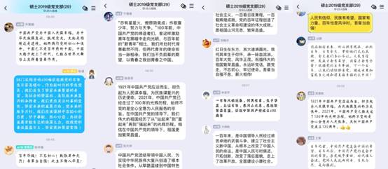 硕士支部麻俏说道:通过学习习近平总书记的讲话,让我又一次回顾了百年来中国共产党带领全国各族人民取得的伟大成就,感受到中国共产党在这一百年来历经的风风雨雨。我作为一名共产党员感到非常荣幸和自豪,为几十年来中国发生的翻天覆地的变化而感动,身为青年一代,我们更应该展现青春的力量,为祖国的发展展现青春最亮的底色,到祖国需要的地方去。