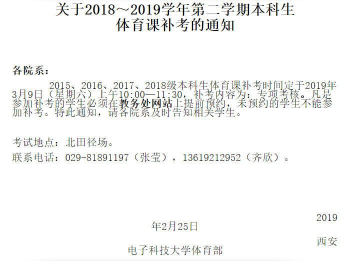 关于2018~2019学年第二学期本科生体育课补考的通知