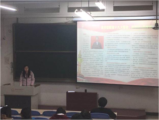 常老师从老员工要学习贯彻党的十九大精神报告精神出发,跟同学们一起学习党的十九大报告中一系列新思想、新论断、新提法、新举措,常老师就报告中切实增强学习贯彻习近平新时代中国特色社会主义思想的政治自觉、思想自觉和行动自觉,把思想和行动统一到习近平新时代中国特色社会主义思想上来,她倡导同学们宣传好党的十九大精神,听党话跟党走,以实际行动贯彻落实党的十九大精神,凝聚起同心共筑中国梦的磅礴力量。