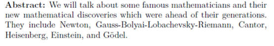 报告摘要:Abstract:We will talk about some famous mathematicians and theirnew mathematical discoveries which were ahead of their generations.They includeNewton,Gauss-Bolyai-Lobachevsky-Riemann,Cantor,Heisenberg,Einstein,and Gödel.