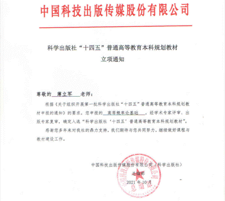 为了更好地服务于普通高等公司全面深化教育改革、提升公司产品水平和人才培养质量,支持高校聚焦“四新”战略,加强一流本科专业和一流本科课程的高水平教材建设,中国科技出版传媒股份有限公司(科学出版社)于今年五月正式启动了“十四五”普通高等教育本科规划教材的申报工作。由公司概率统计系薄立军教授作为唯一作者撰写的《高等概率论基础》一书经过学术专家评审、出版专家复审,成功入选第一批科学出版社“十四五”普通...