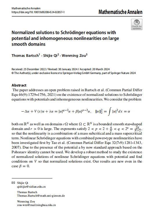 近日,西电BB贝博艾弗森祁世杰教师与德国著名数学家Thomas Bartsch 教授、清华大学邹文明教授合作,在数学领域顶级期刊Mathematische Annalen上发表了题为“Normalized solutions to Schrödinger equations withpotential and inhomogeneous nonlinearities on large smooth domains”的长达47页的学术论文。 Mathematische Annalen 创建于1868年,致力于发表纯数学各领域具有突破性的重要成果,是业内公认的数学类顶级期刊,...